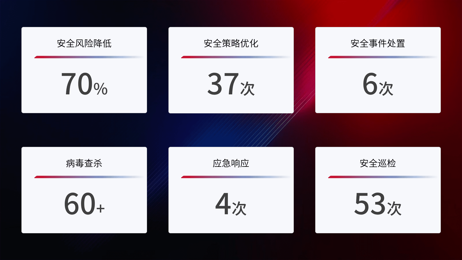 提供全面的安全事件报告体系,,,,包括处置报告、、周报、、、、季度和年度总结,,,结合持续监控,,,帮助客户深入了解网络安全状况。。。。