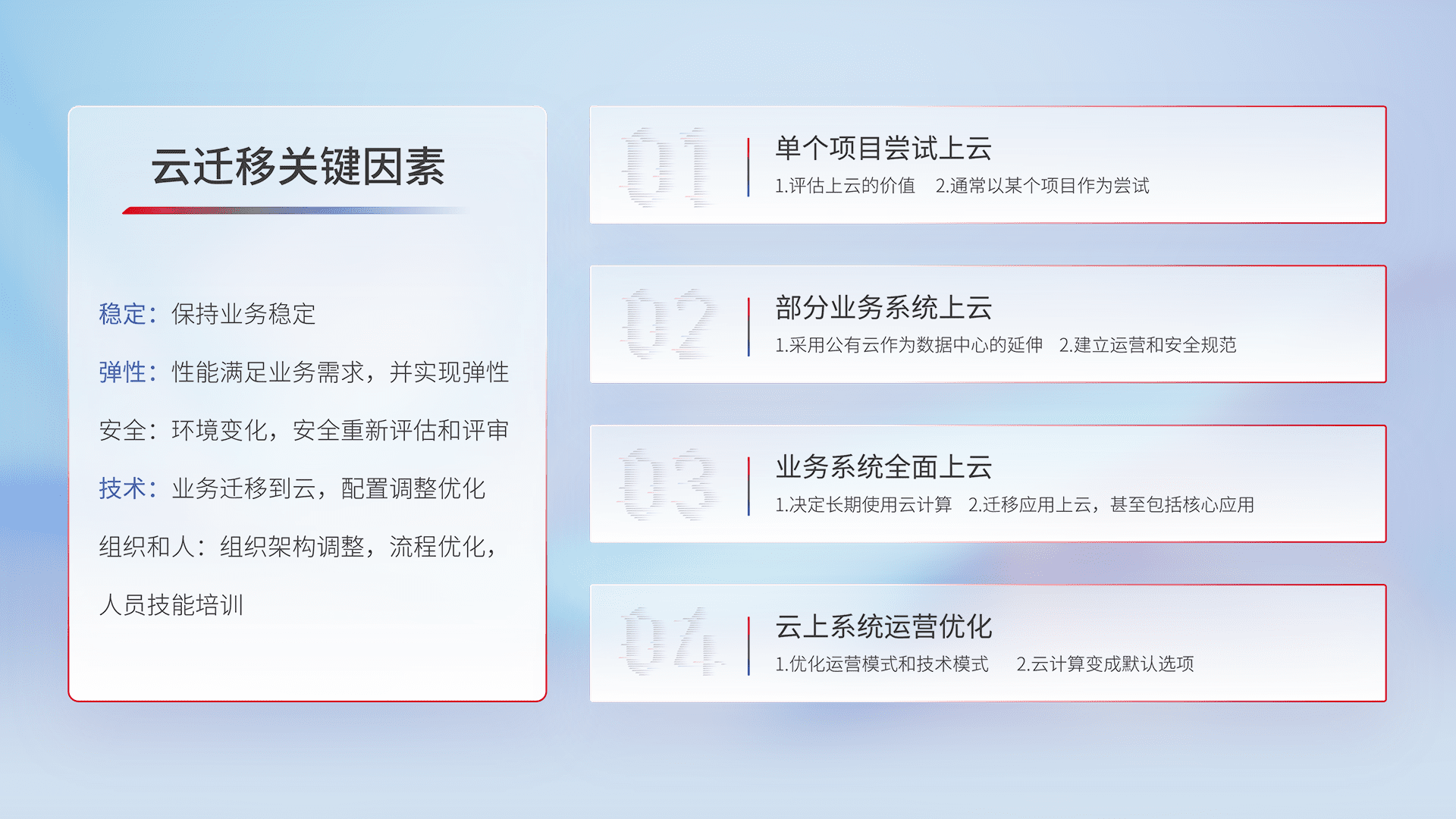 结合实际业务,,从规划设计、、云平台选型、、、、云原生改造、、数据迁移、、、集成交付,,,迁移全过程为客户识别最佳上云路径,,做好风险识别管理,,设计网络架构、、身份权限、、安全审计合规、、、、操作审计、、、、日志审计、、监控告警策略、、、、多站点容灾设计等,,,,对云上基础设施进行整体规划,,提升IT治理水平,,,以满足弹性、、、、高可用、、、高性能的需求。。。