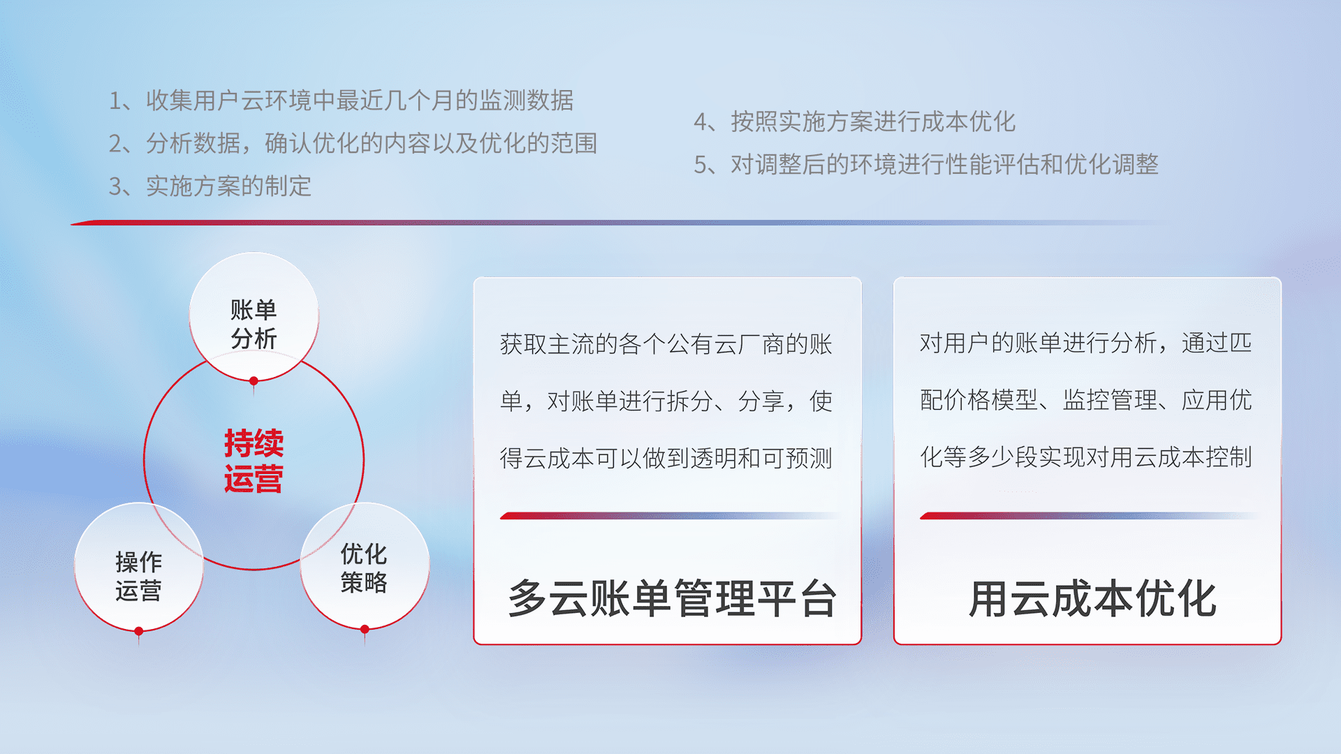 通过多云纳管,,,以统一的资源数据模型把客户的云资源进行抽象和封装,,进而实现对多云资源的统一操作,,,保障云资源管理的可靠性、、稳定性与可用性。。。。量身定制化运维内容,,,配置、、、、开发运维、、、补丁管理、、、、备份、、监控、、、、认证和访问管理、、、审计和日常巡检等,,,,保障在用云过程中的可靠度,,,稳定度以及高可用率。。